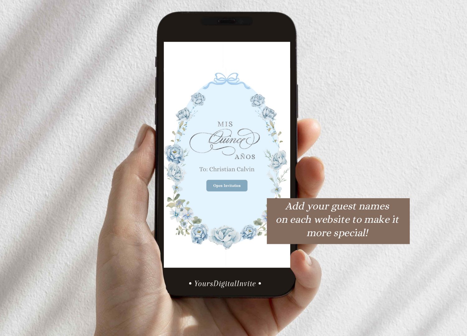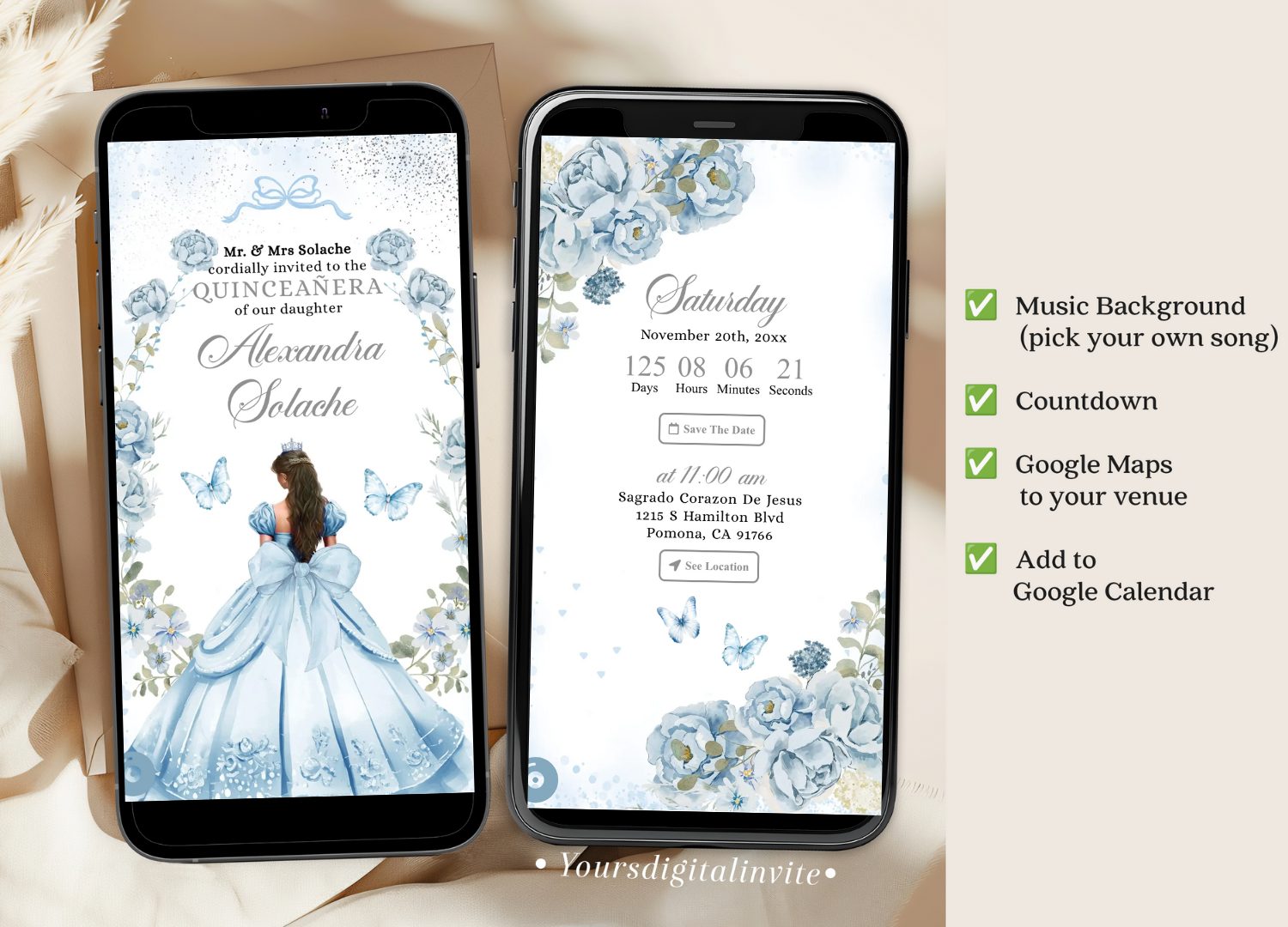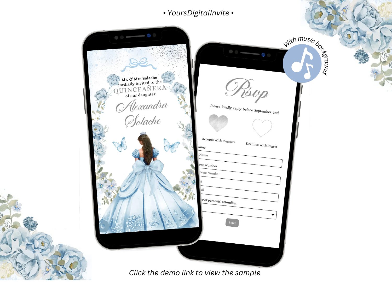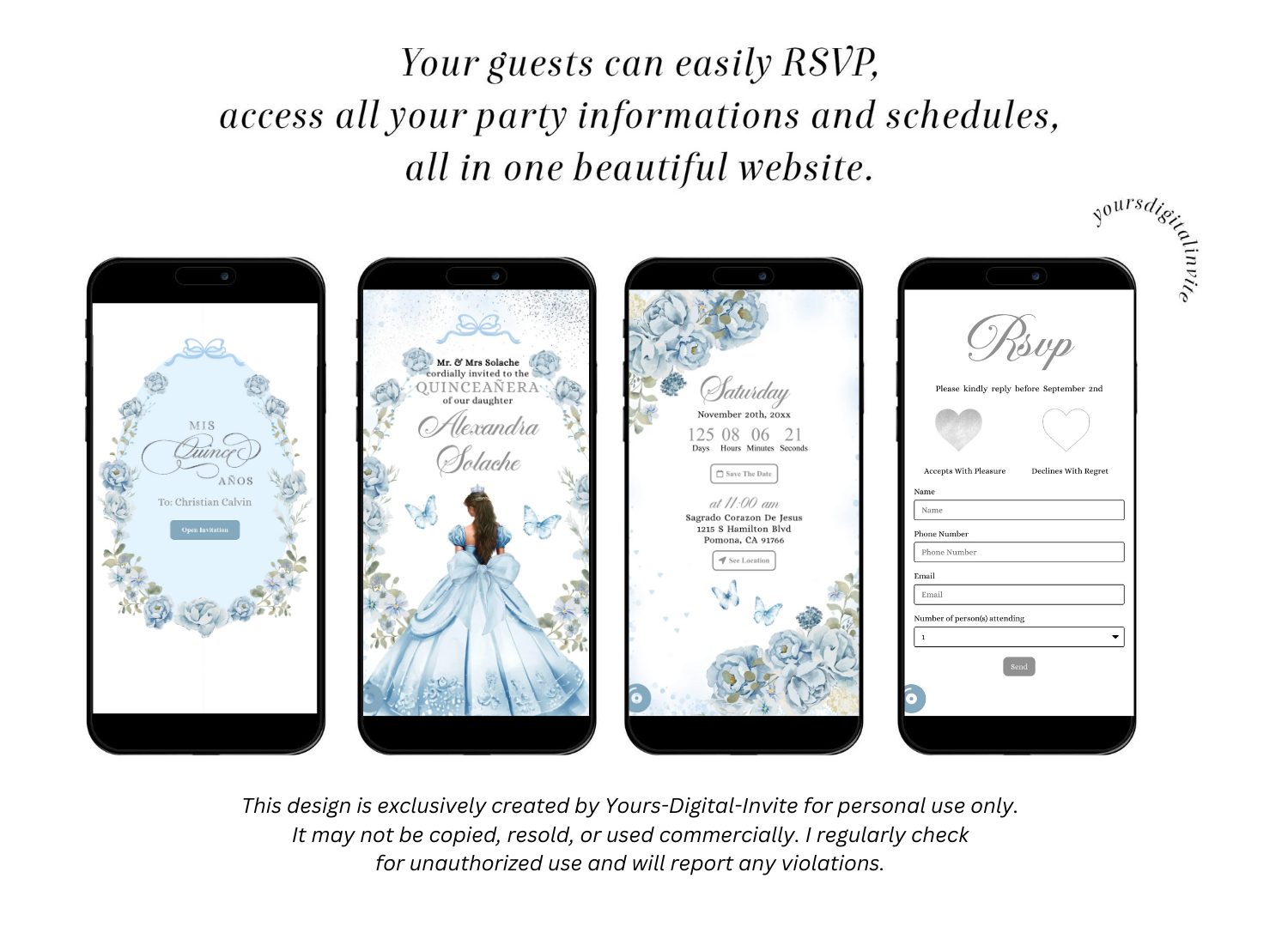 Keywords: Dusty Blue Coquette Bow Princess Quinceanera Invitation, Blue Floral Butterfly Sweet 16th, Editable Mis Quince XV Años Mini Web RSVP