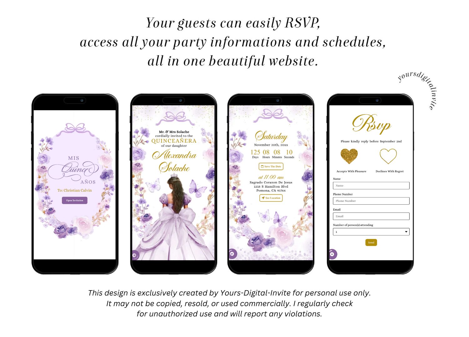 Our mini-website invitation will impress your guests! With just one stunning website, your guests can RSVP with ease and view all the party details and schedules.