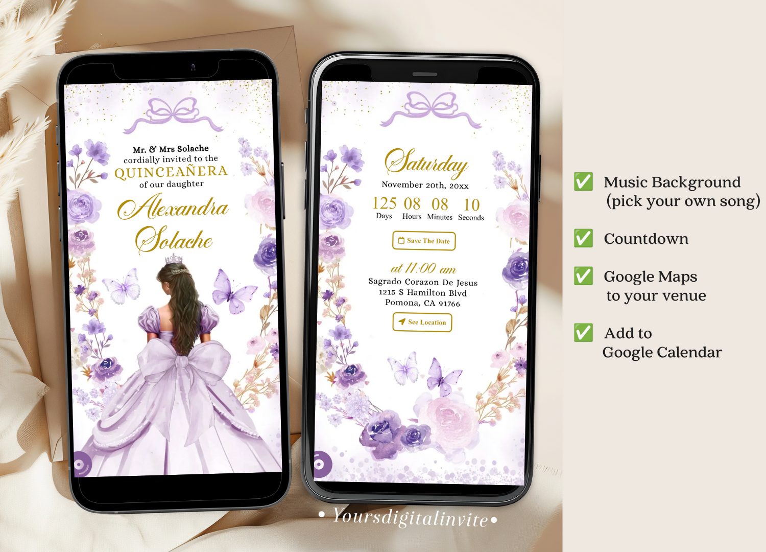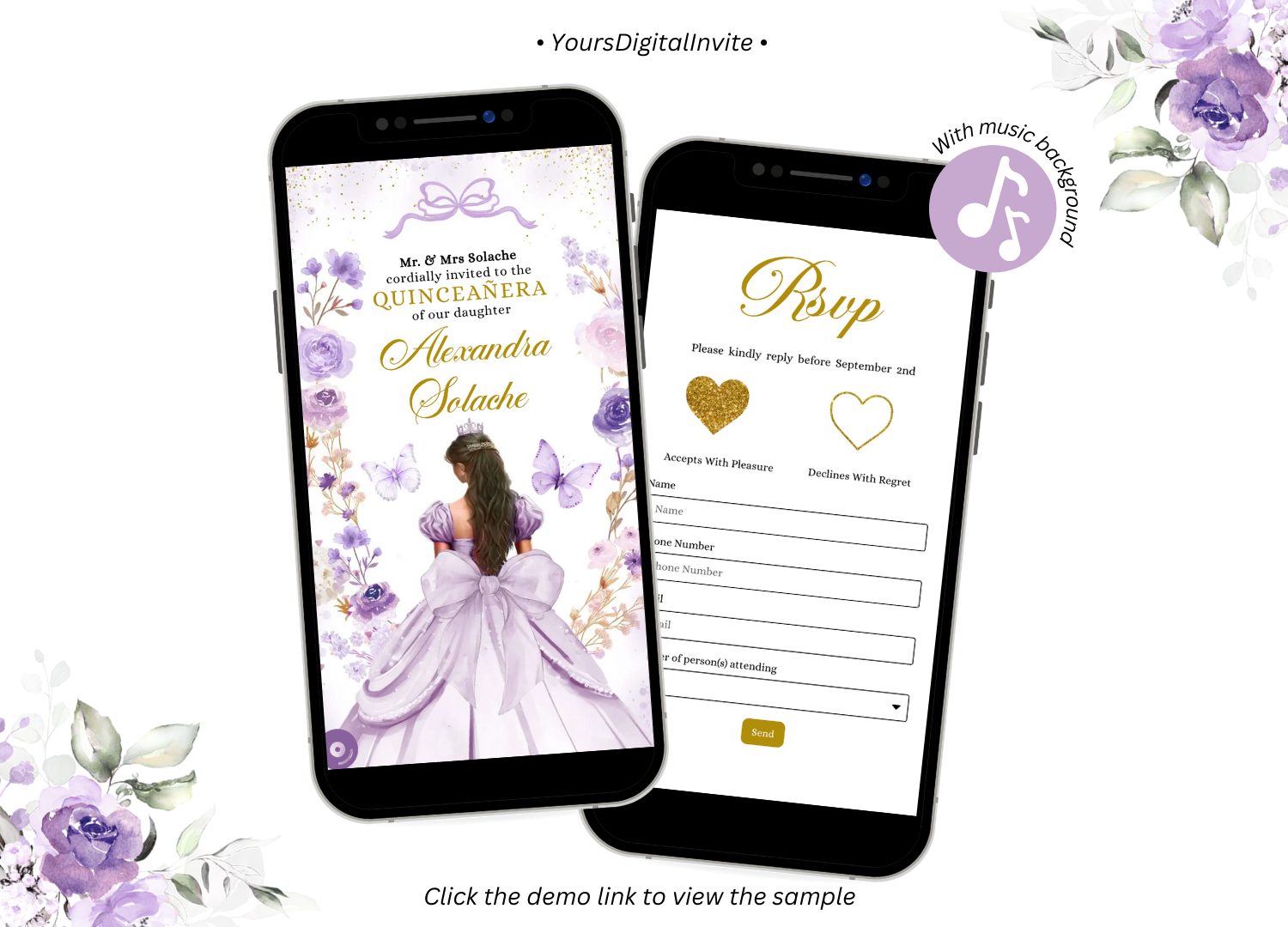 Keywords: Lilac Purple Coquette Bow Princess Quinceanera Invitation, Purple Floral Butterfly Sweet 16th, Editable Mis Quince XV Años Mini Web RSVP