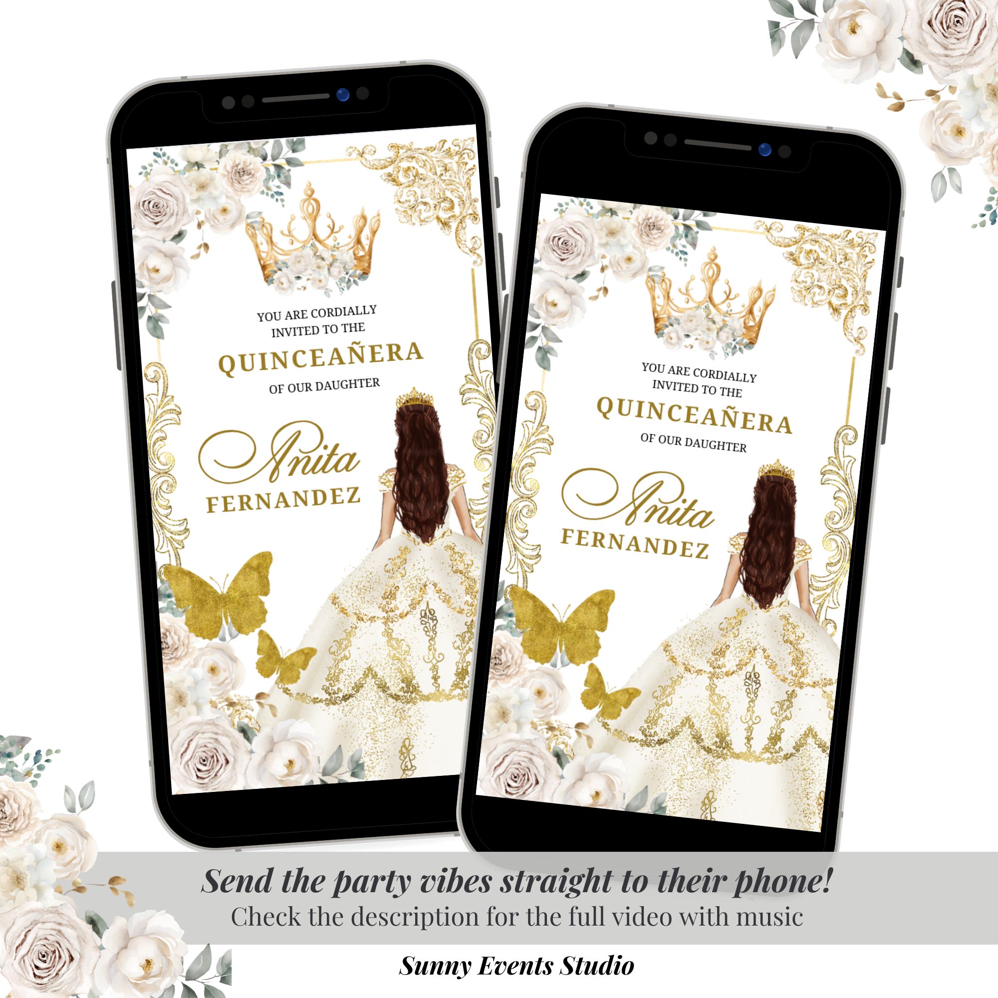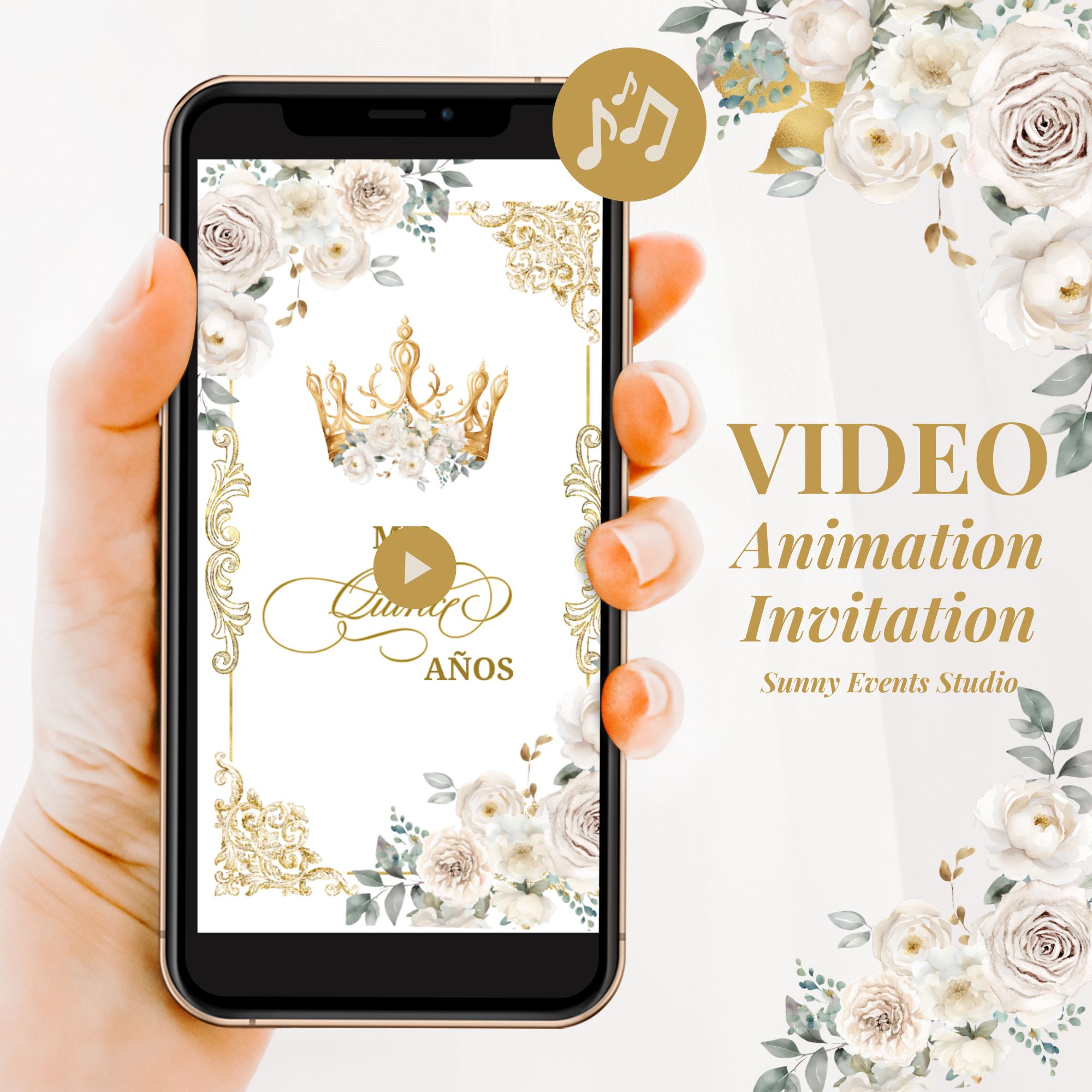 Keywords: Animated Elegant Ivory Champagne Princess Quinceanera Invitation, Gold Crown XV Invitation, Mis Quince Anos Animated Video Invitation