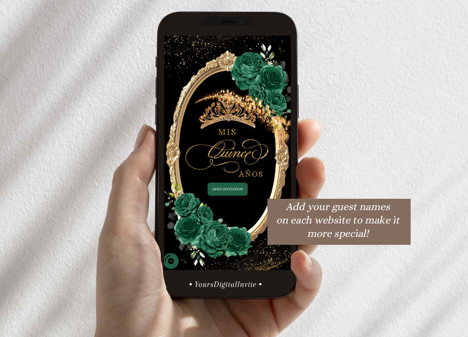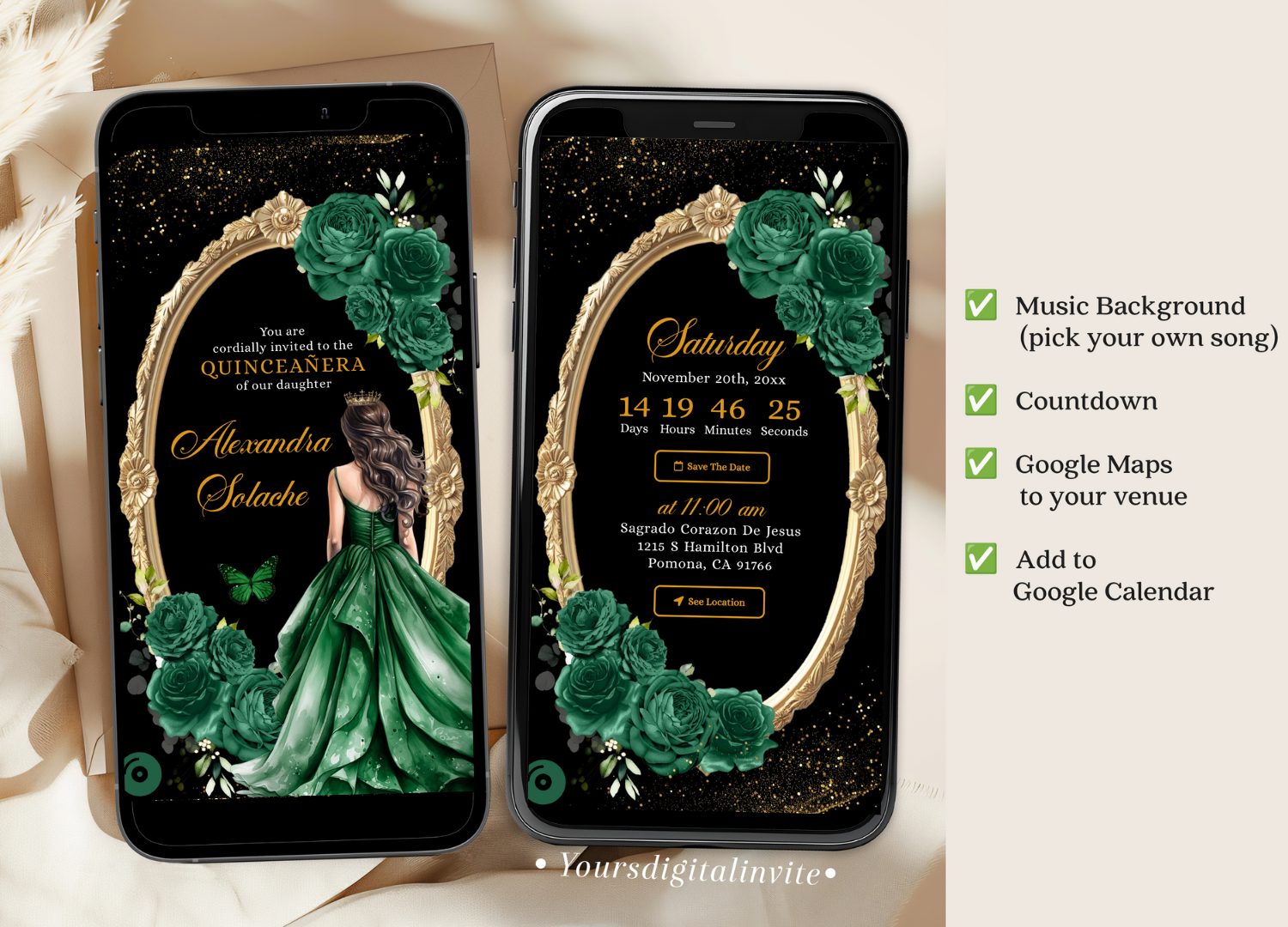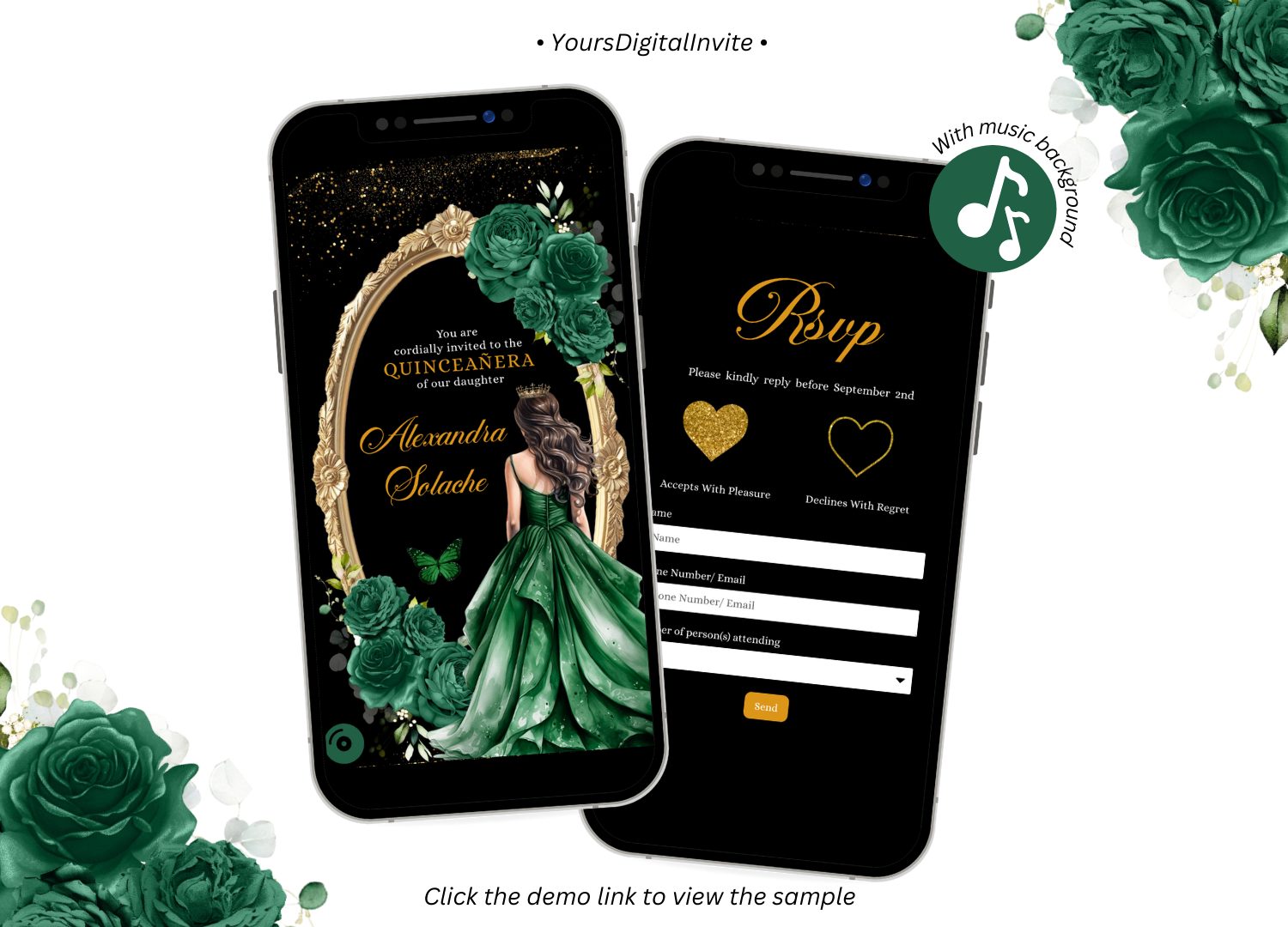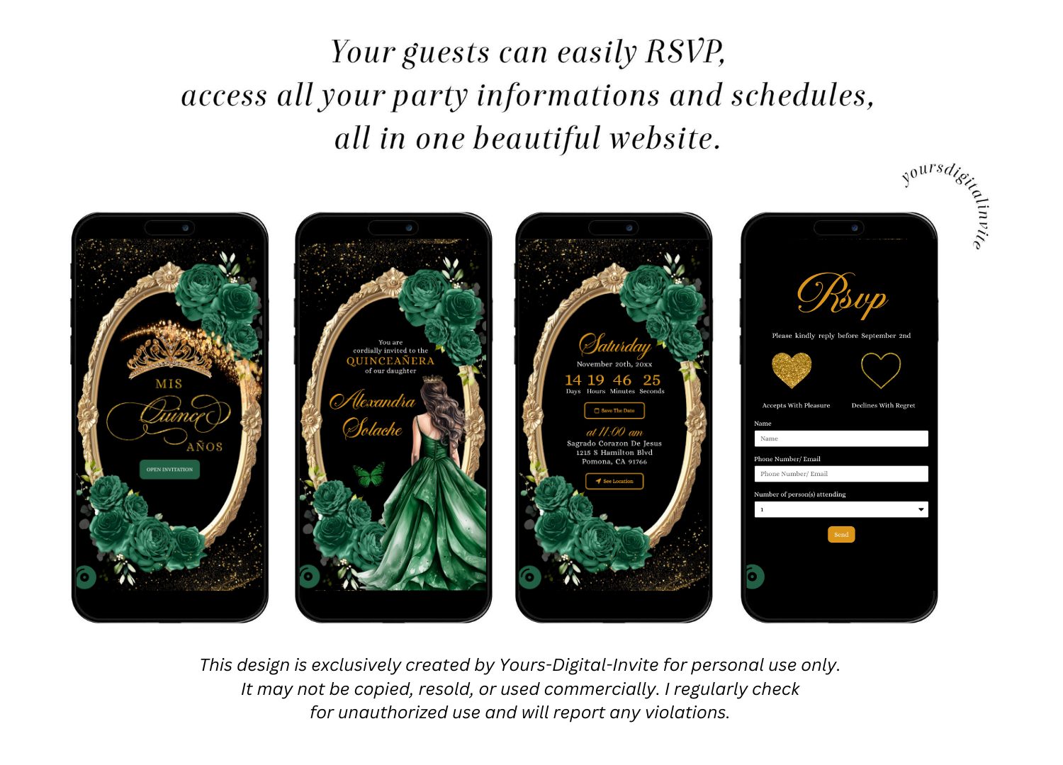 Keywords: Black and Emerald Green Roses Quinceañera Invitation, Emerald Floral Royal Princess XV Invitation, Green Butterfly Gold Mis Quince Años