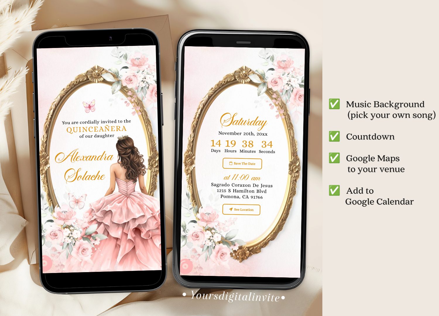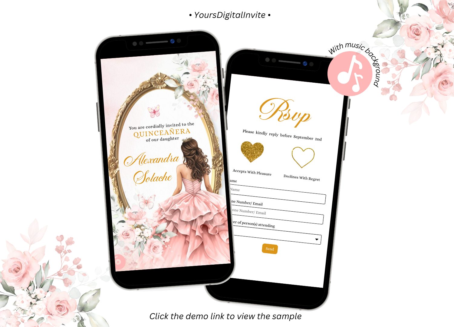 Keywords: Blush Pink Roses And Gold Quinceañera Invitation, Pink Floral Royal Princess XV Invitation, Pink Butterflies Mis Quince Años XV Mini Web