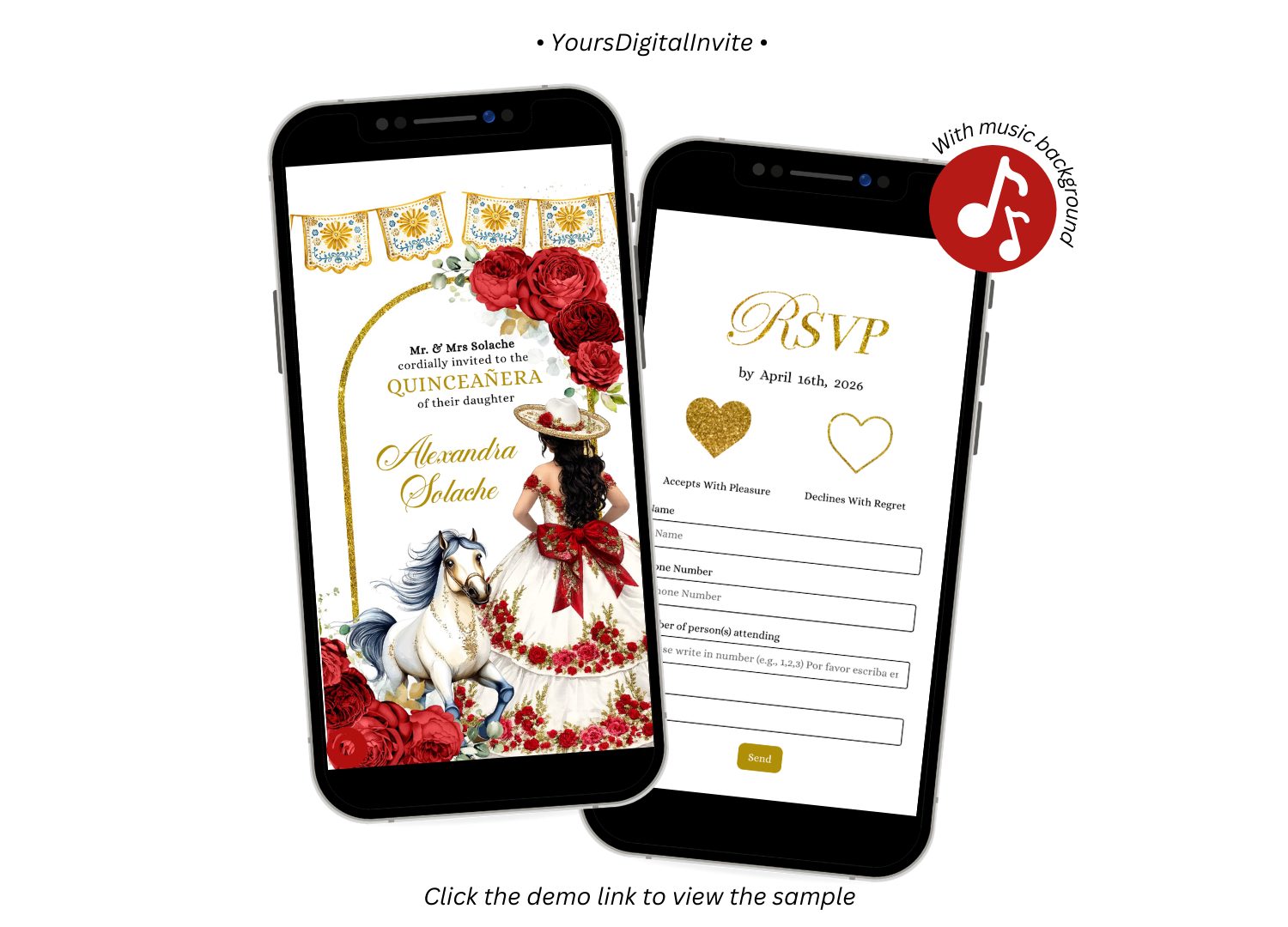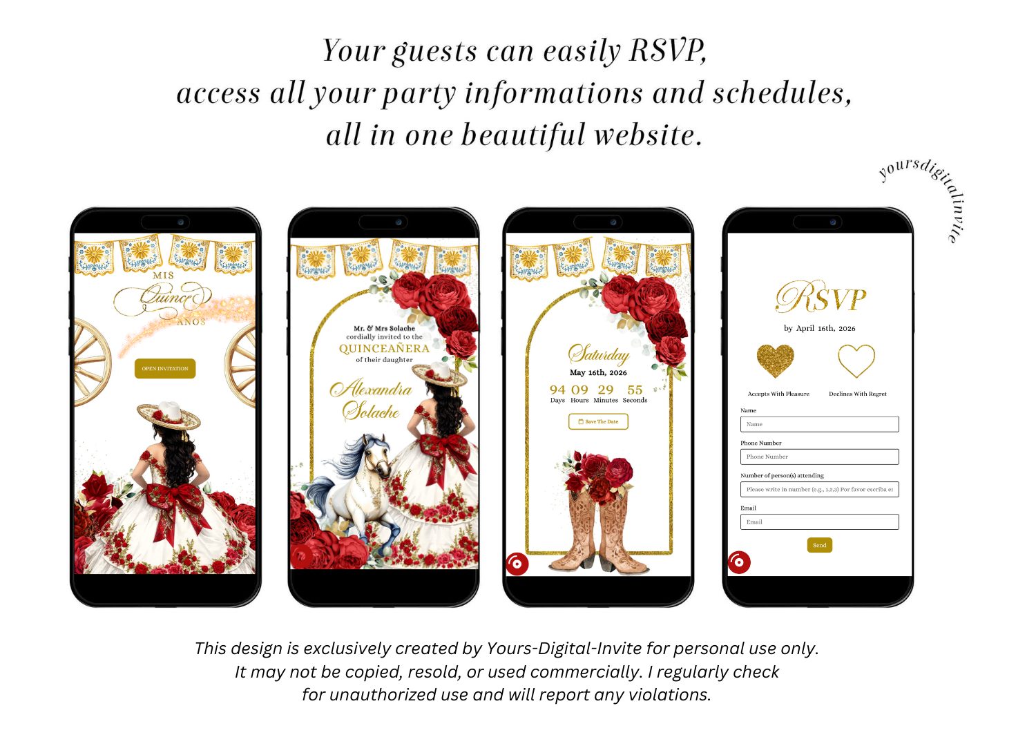 Keywords: Red and White Rose Charra Quinceanera Invitation, Mexican Princess Sweet 16th Invite, Floral Talavera RSVP, Mis Quince XV Mini Website A30