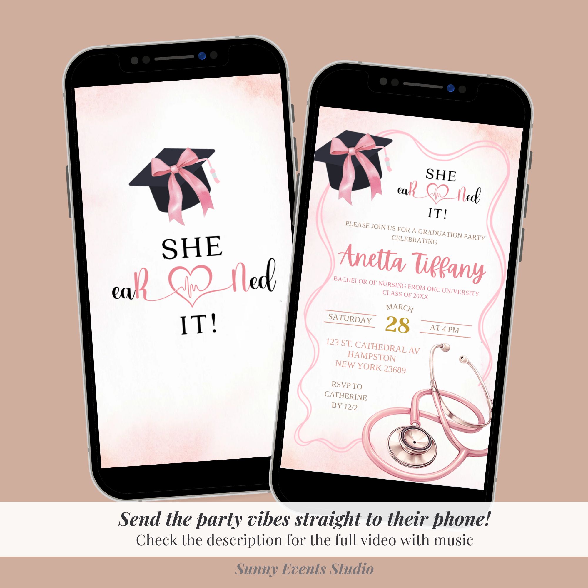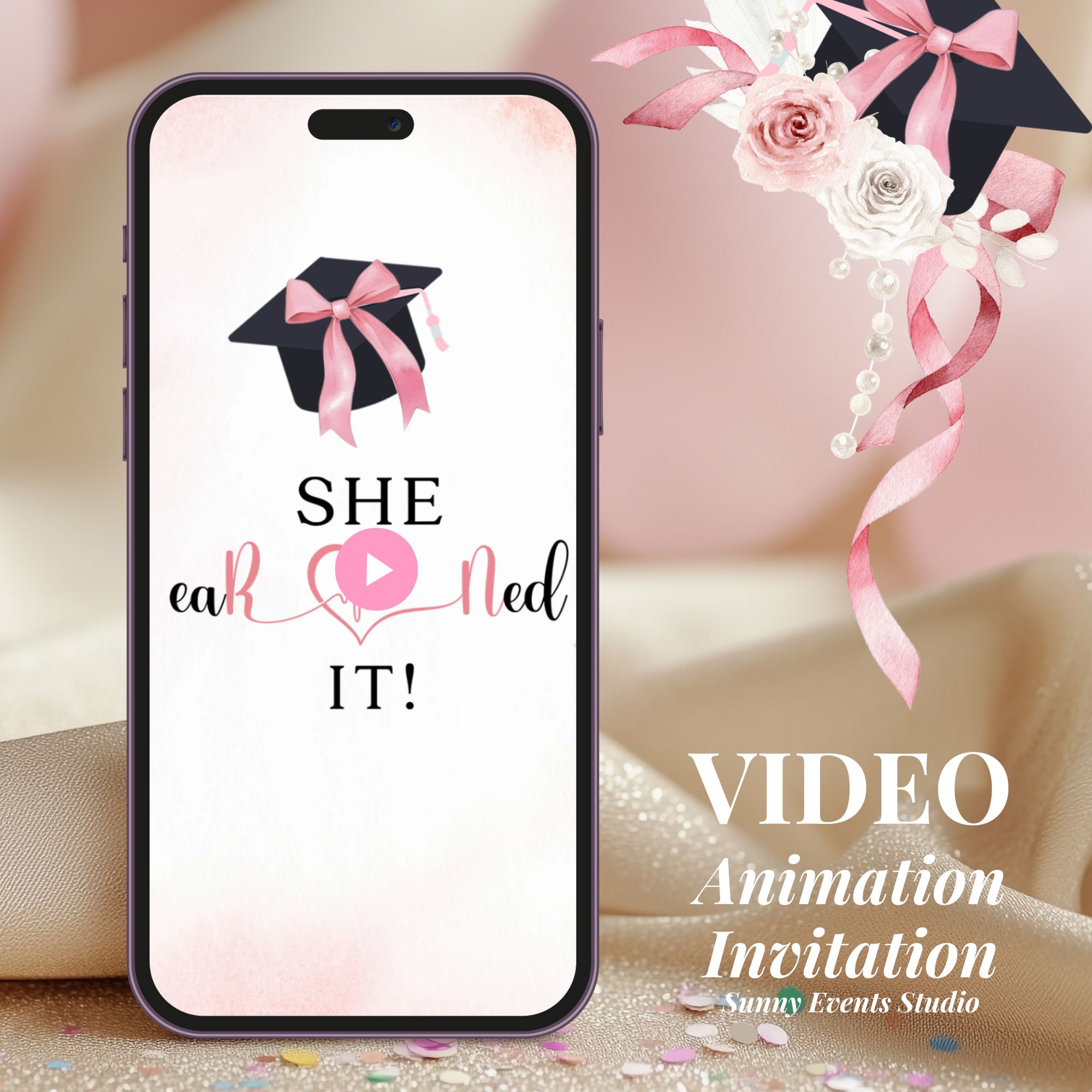 Keywords: Animated Pink Coquette Bow Nurse RN Graduation Video Invitation, Boho Pink Coquette Nurse College Graduation Video Invitation