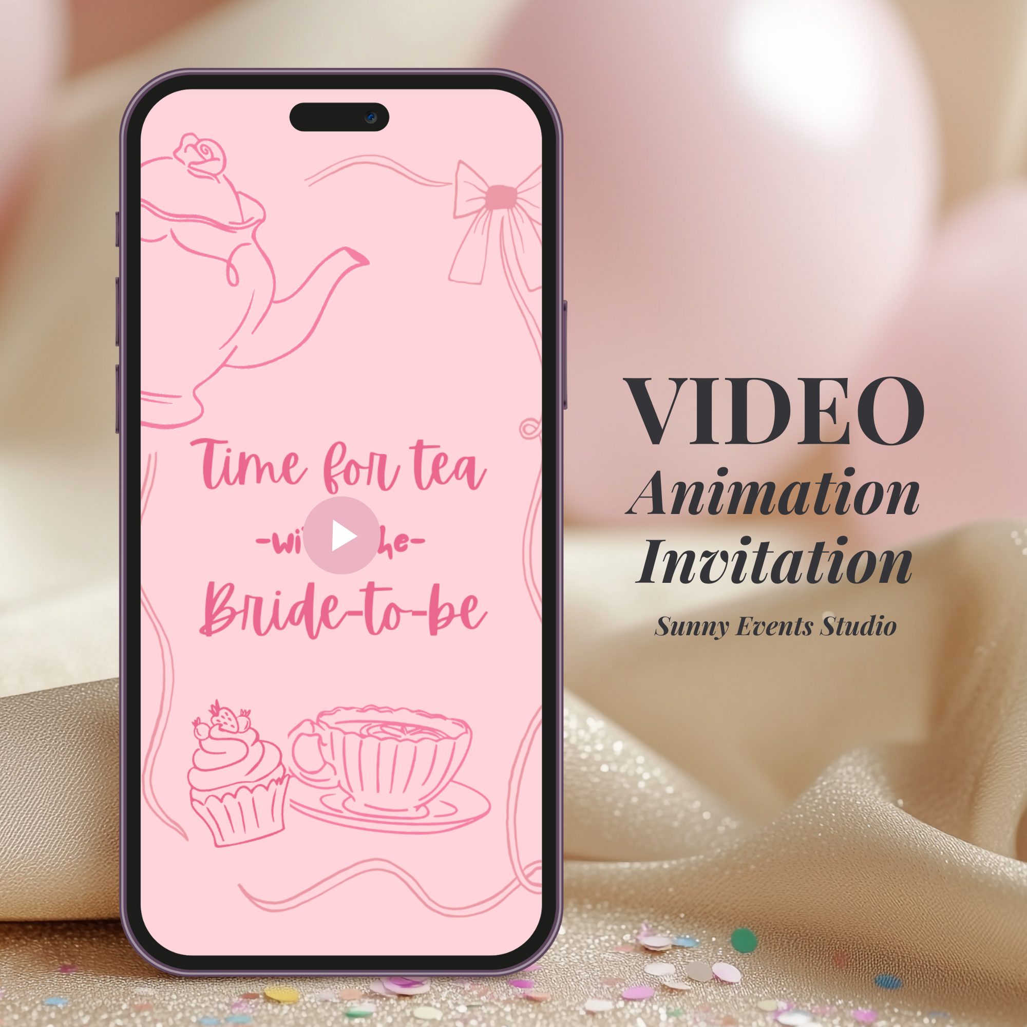 Keywords: Animated Pink Hand Drawn Bridal Tea Party Video Invitation, Boho Pink Bow Coquette Bridal Shower Brunch Animated Video Invitation