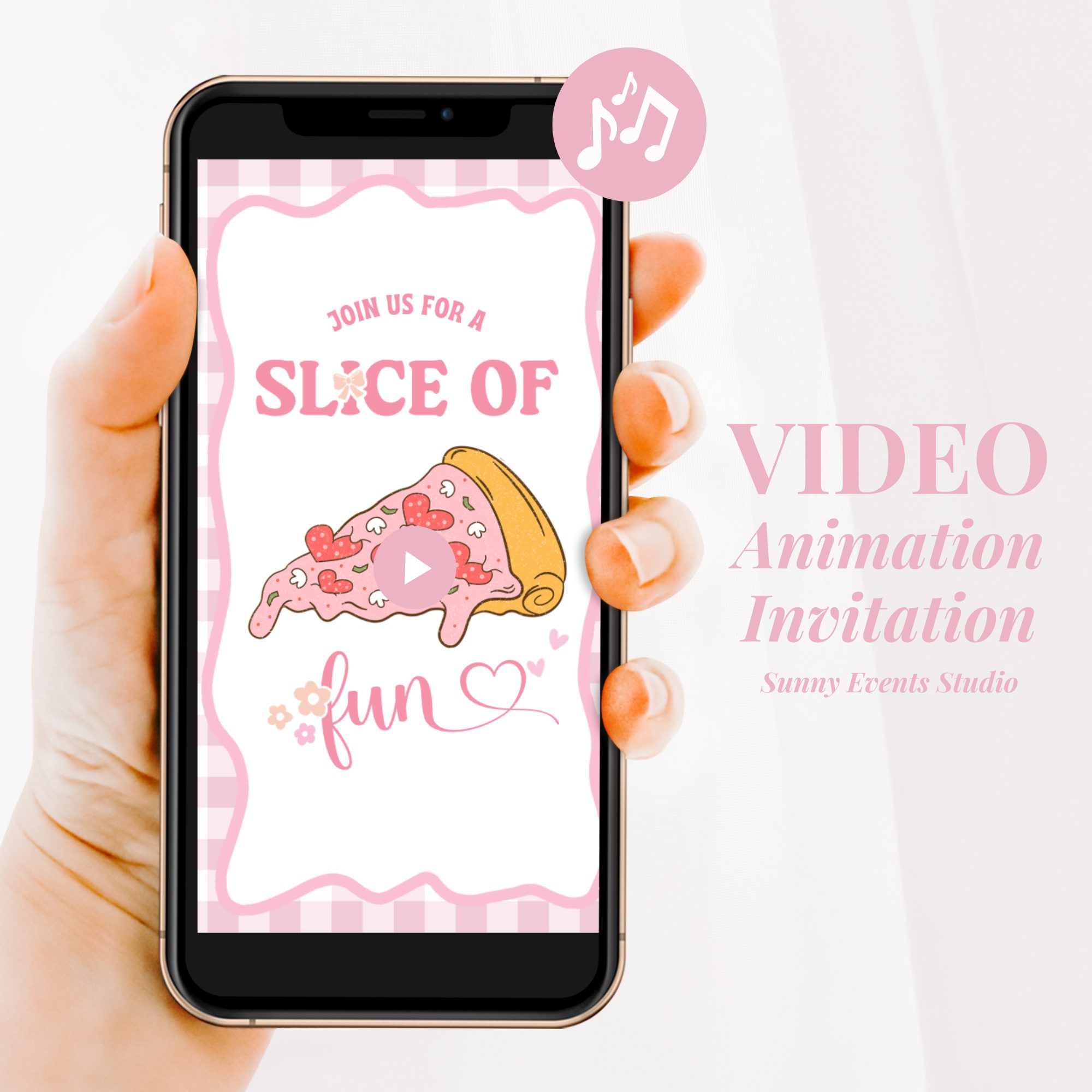 Keywords: Preppy Slice of Fun Pizza Party Birthday Video Invitation, Pink Bow Italian Pizza Birthday Girl, Retro Daisy Flower Animated Birthday