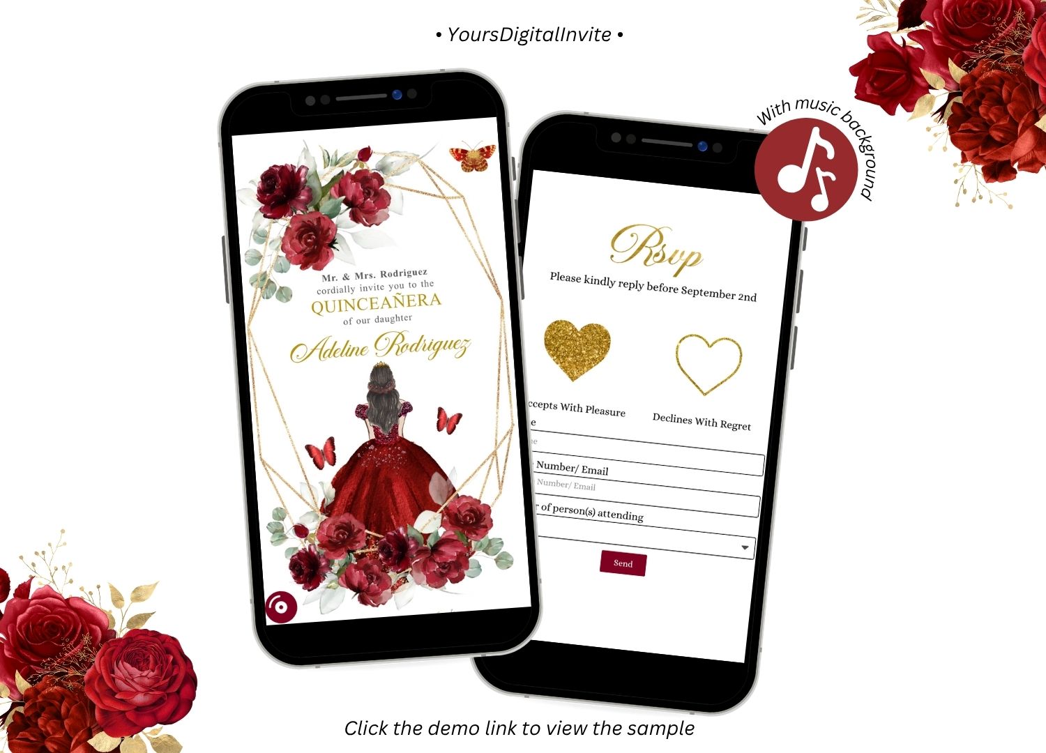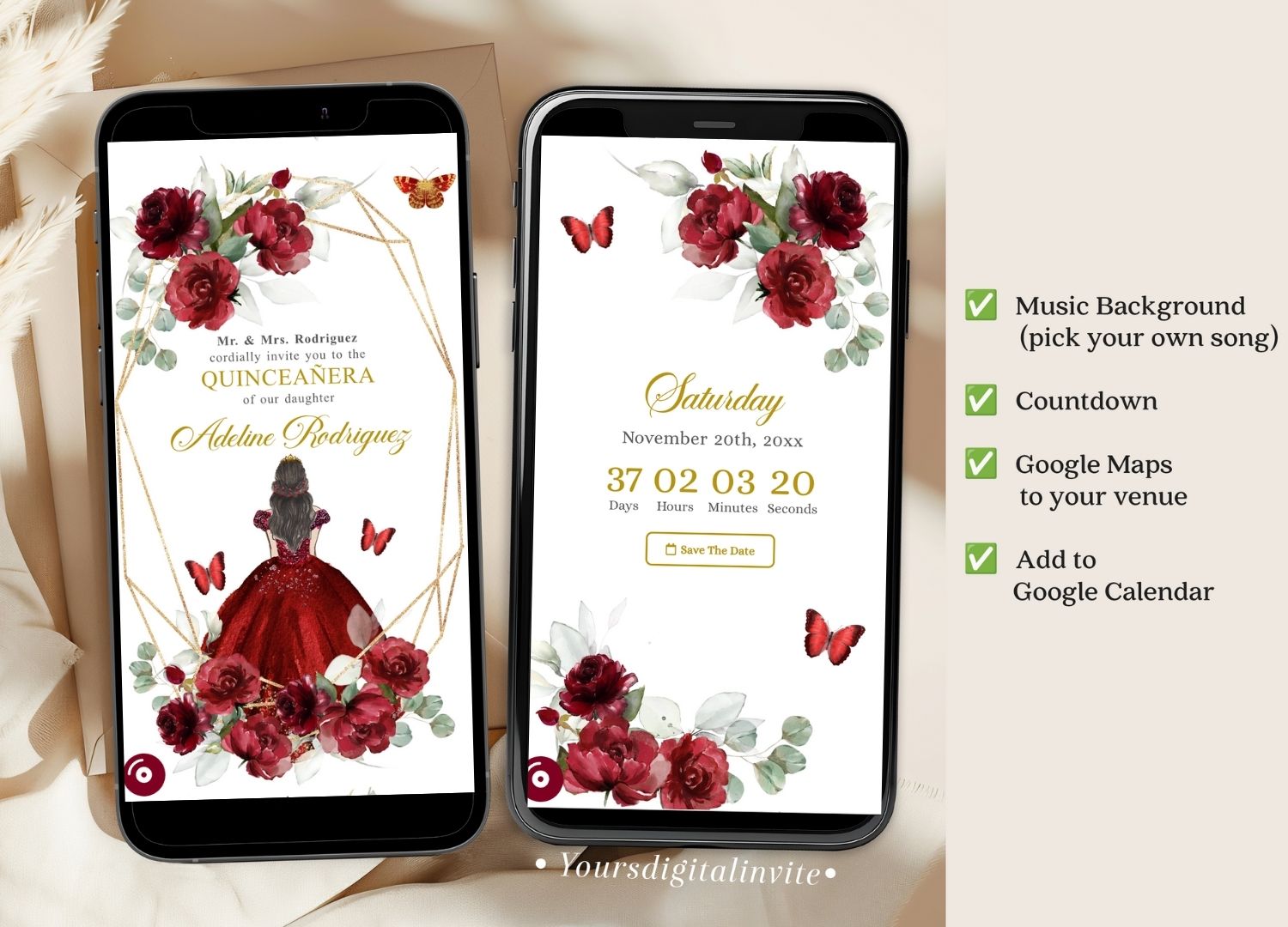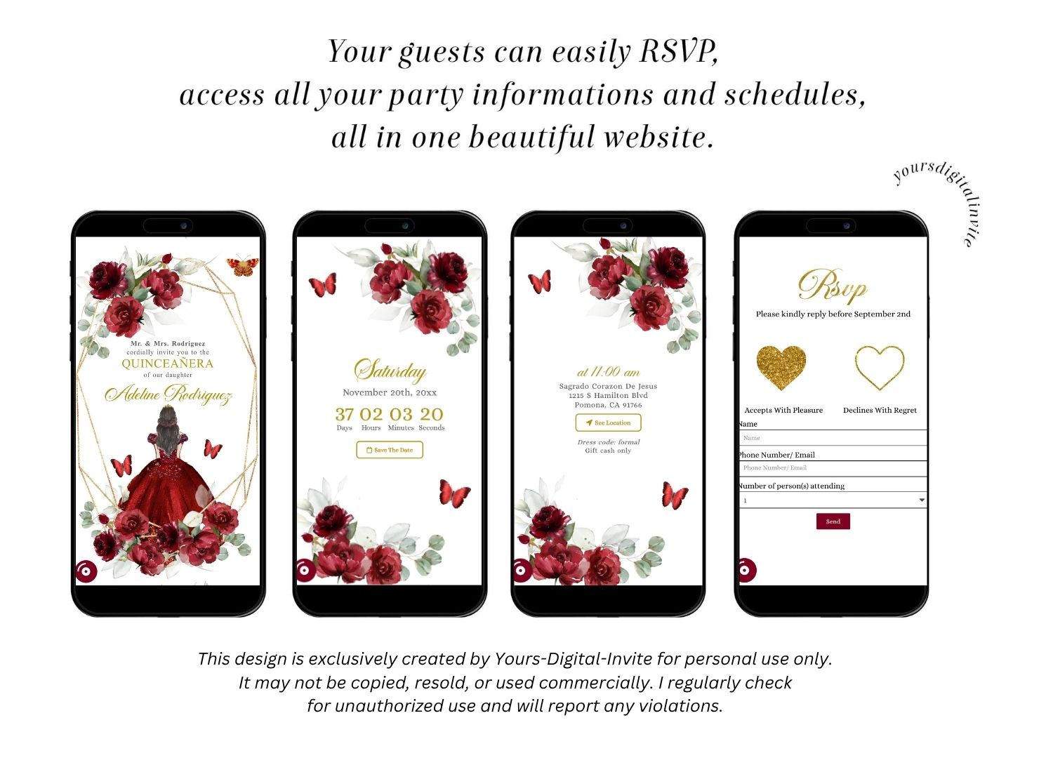 Keywords: Digital Red Burgundy Rose Princess Quinceañera Web Invitation, Red Floral Butterfly Quince Online RSVP, Gold Mis Quince Años Mini Website